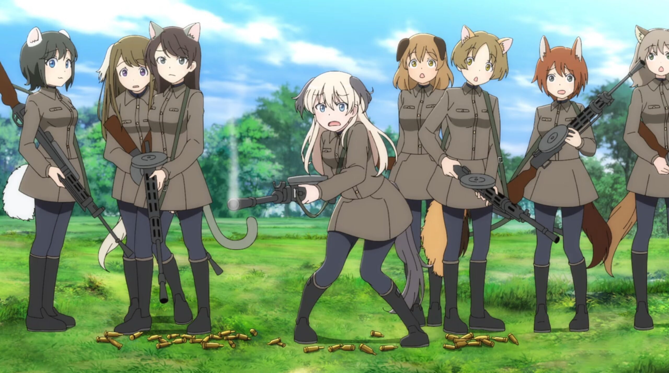 A group of girls in military uniforms holding guns. They each have some sort of animal feature, such as cat ears or tails