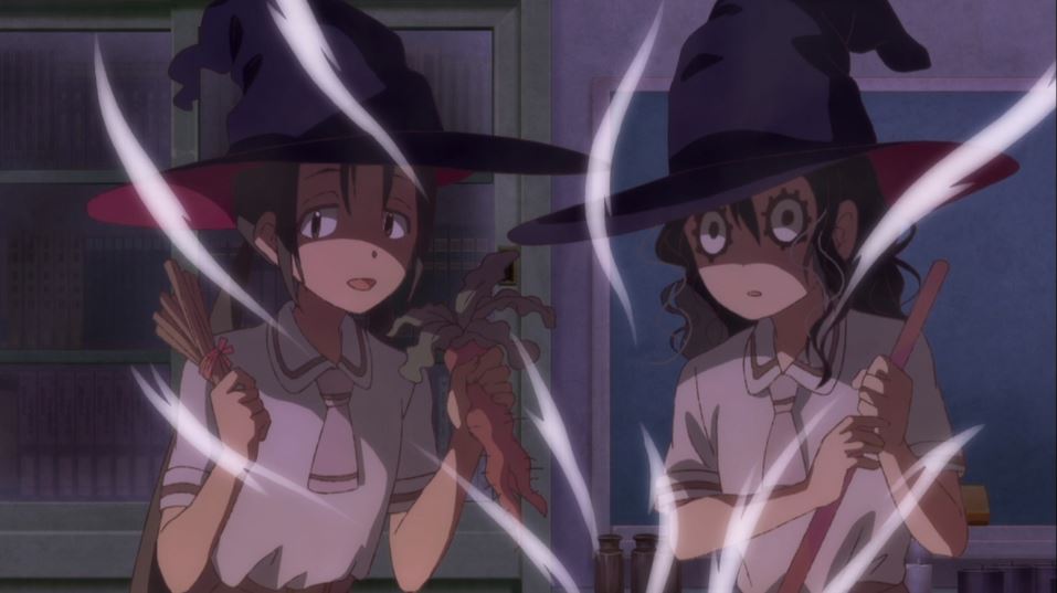 the two occult club members of Asobi Asobase working over the fumes of a bubbling cauldron
