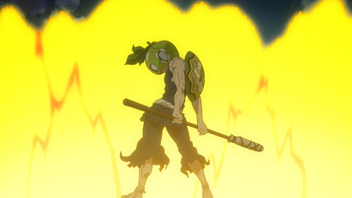 a spear-wielding warrior in a watermelon mask standing in front of an explosion