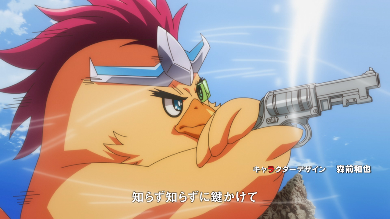 A rotund chicken-like bird with a wild mohawk, sharp green eyes, and a circlet. He wears a scouter, similar to those worn by sayans in Dragon Ball and aims a hand cannon revolver.