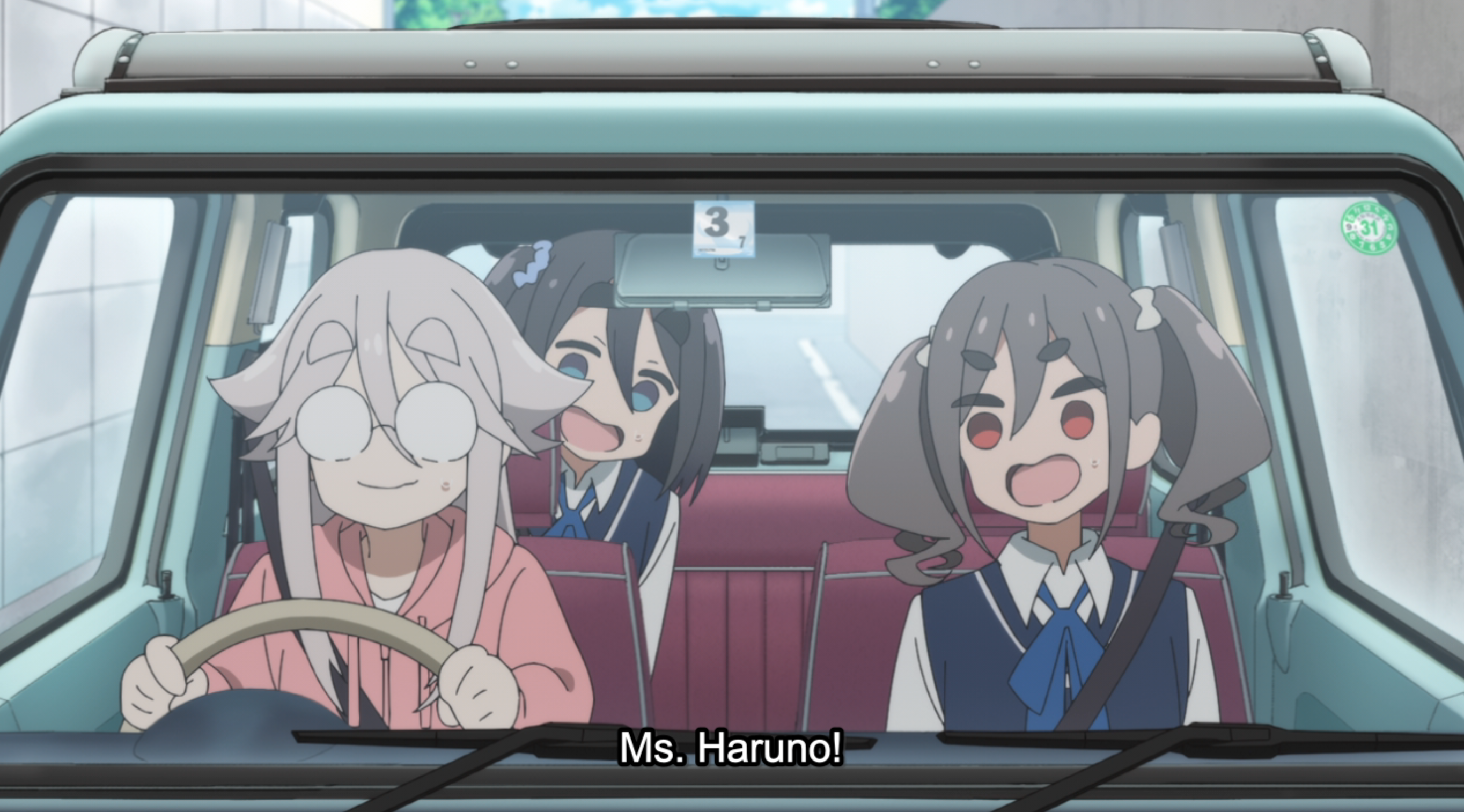 Haruna, An, and Satsuki sitting in a car together. Haruna is behind the wheel wearing a big vacant smile. An and Satsuki are both yelling at her