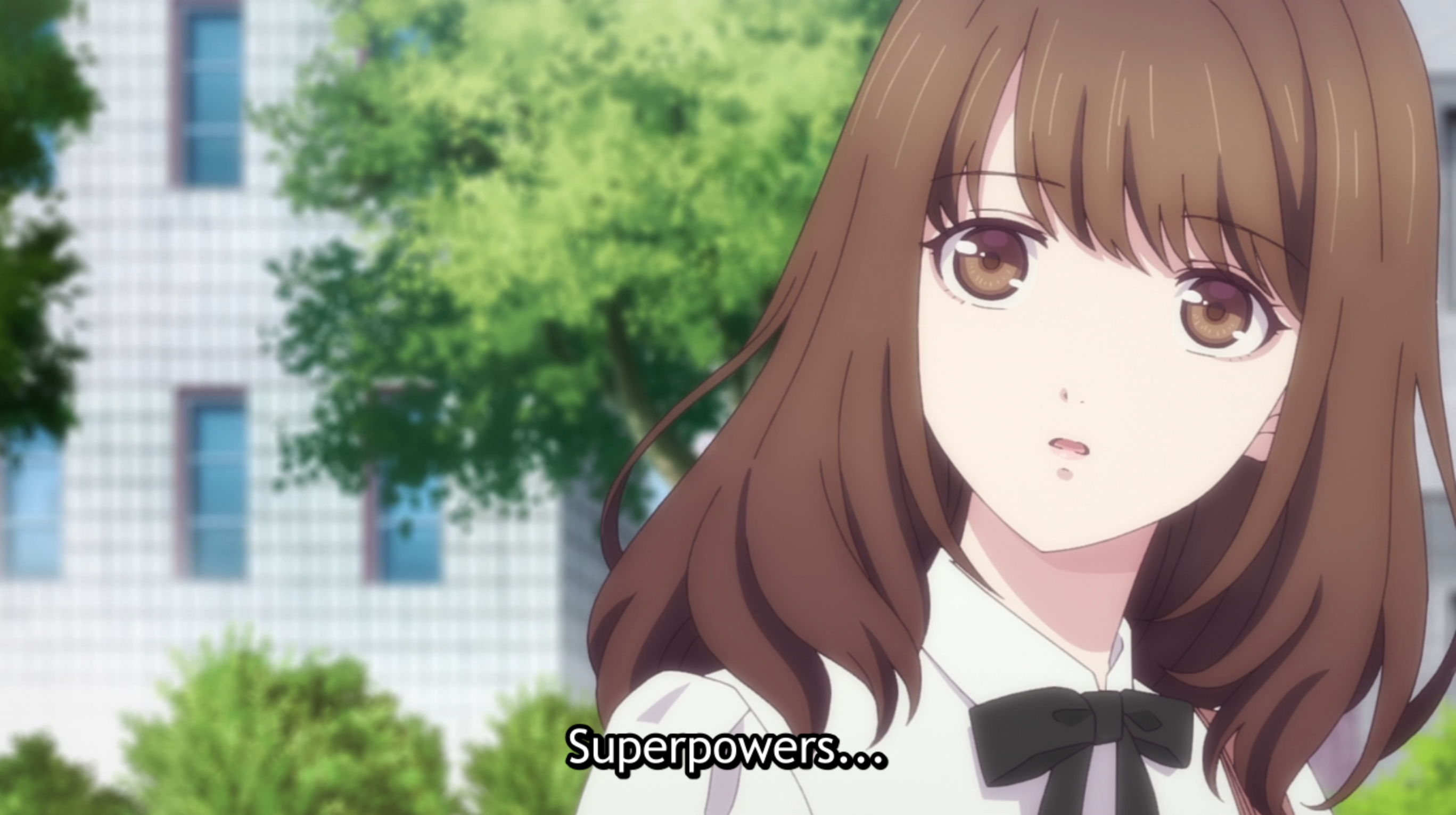 Closeup of a young woman's confused face. Subtitle reads: "Superpowers..."