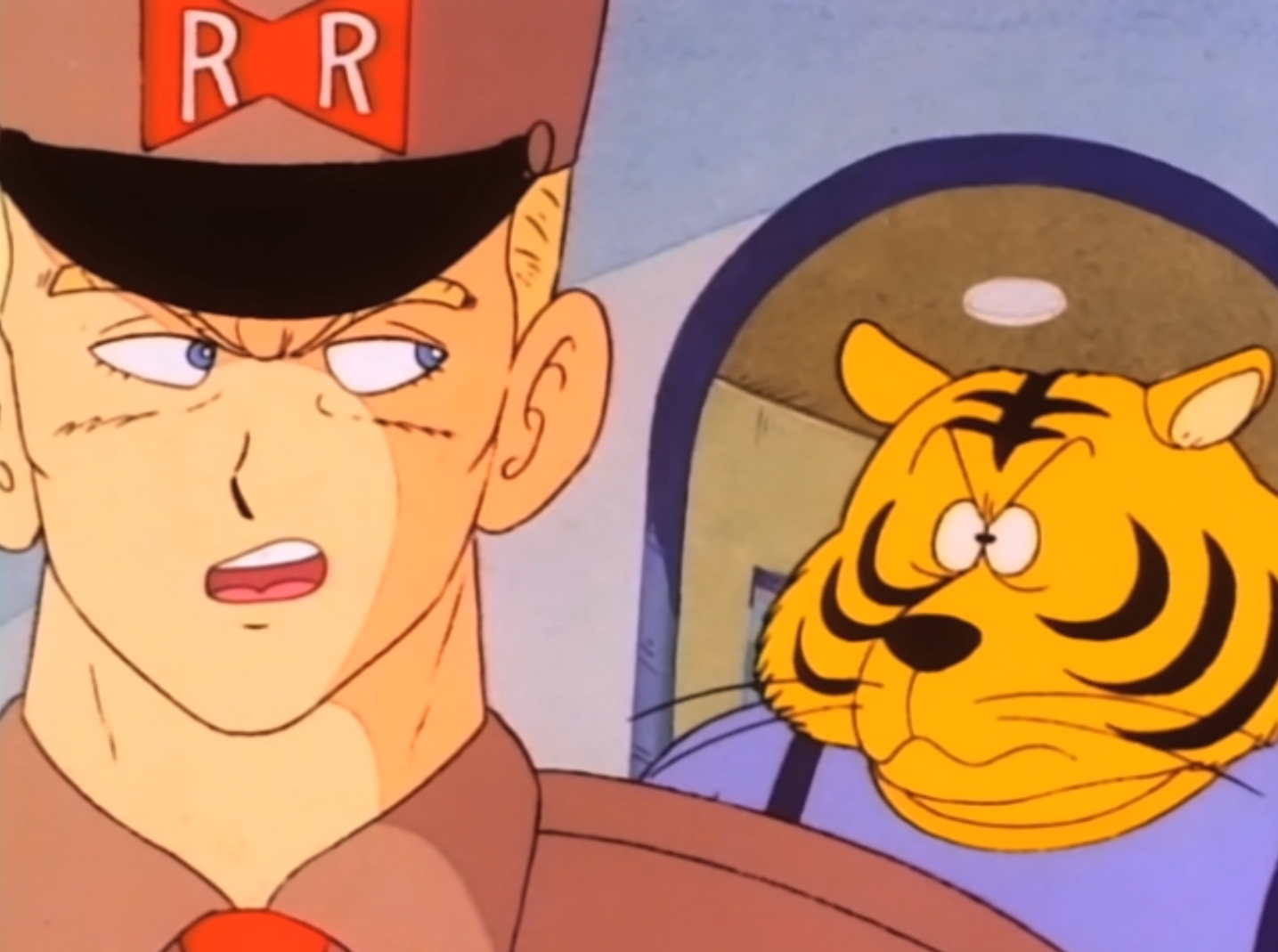 Close-up of General Blue talking over his shoulder to an anthropomorphized tiger