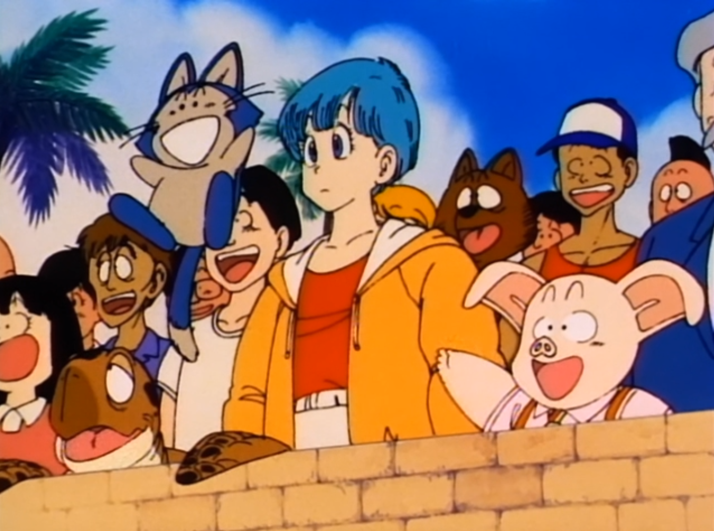 Bulma standing behind a brick wall as part of a cheering audience watching a tournament