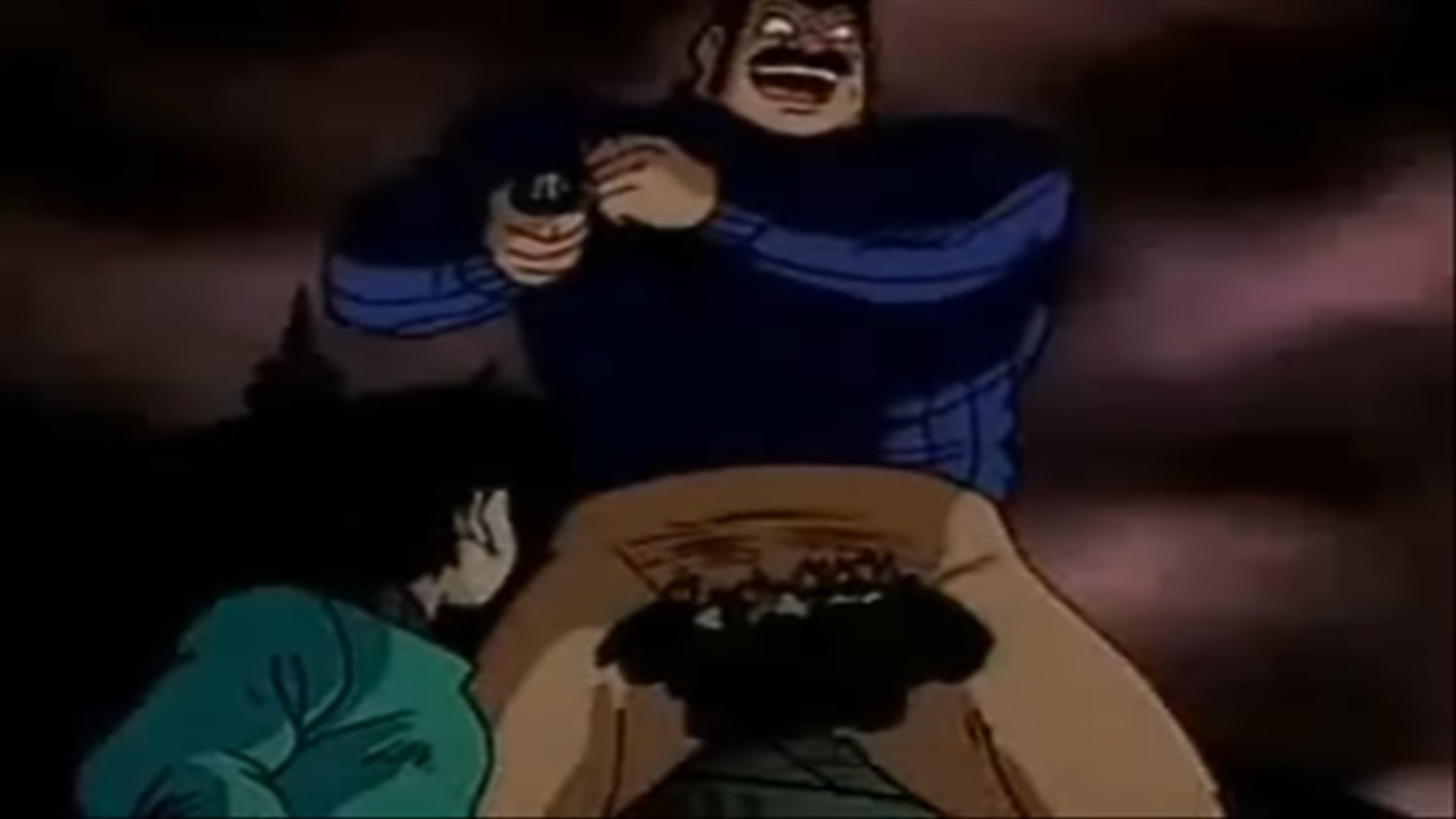 Sleepy stands over Daizaburo, grenade in hand. He wears no pants and in the place of underwear, he has a cluster of even more grenades.