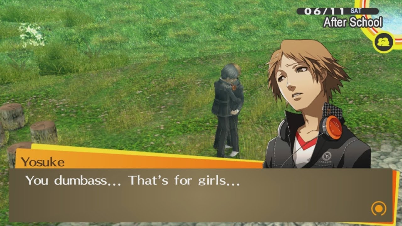 None of this matters to Yosuke, who both bullies Kanji throughout the game for possibly being gay and objectifies the girls in the party. When I first played the game, I got the sense that Yosuke himself was deep, deep in the closet and overcompensating.