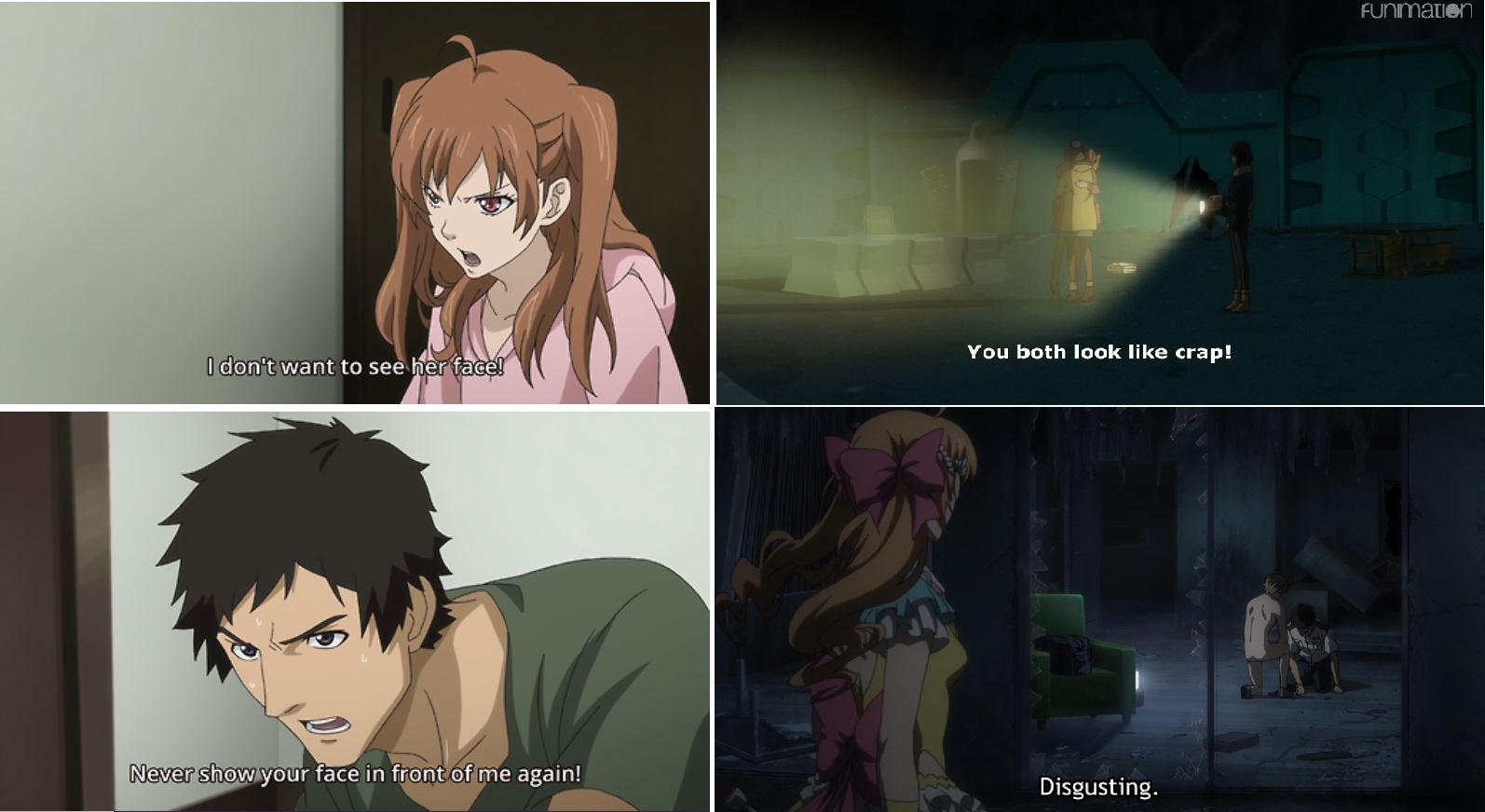 Meanwhile, Mari is kidnapped and brutally tortured by the new, very real Big Bad and berated for failing to embody the ideals of heroism; the first cour ends with her stumbling on stage for a concert in her ripped clothes, singing anguished and off-key as the credits roll. She essentially spends the rest of her time in the series recovering from the post-traumatic stress of this event. The final straw is the moment King Torture bows in deference to Moe for selflessly sacrificing herself to be tortured in Mari’s place. While Mari is overdue for a reckoning at that point, it is difficult not to notice the subtext of a domineering woman (a literal ball-buster, in fact) being put in her place while a faithful, uncomplaining, self-sacrificing woman named Moe is held up as the feminine ideal. And King Torture’s sneering comment that Mari is disposable, unlike a lot of the meta-commentary in the series, ends up being simple fact when she and the other Flamenco Girls are promptly sidelined for the entire middle arc.