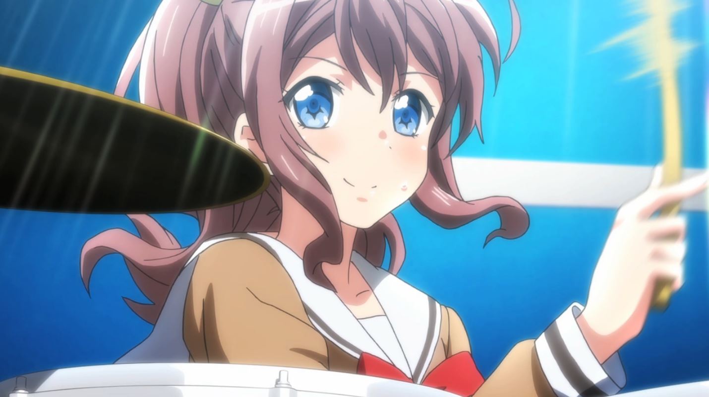 Saya Yamabuki smiles while playing the drums.