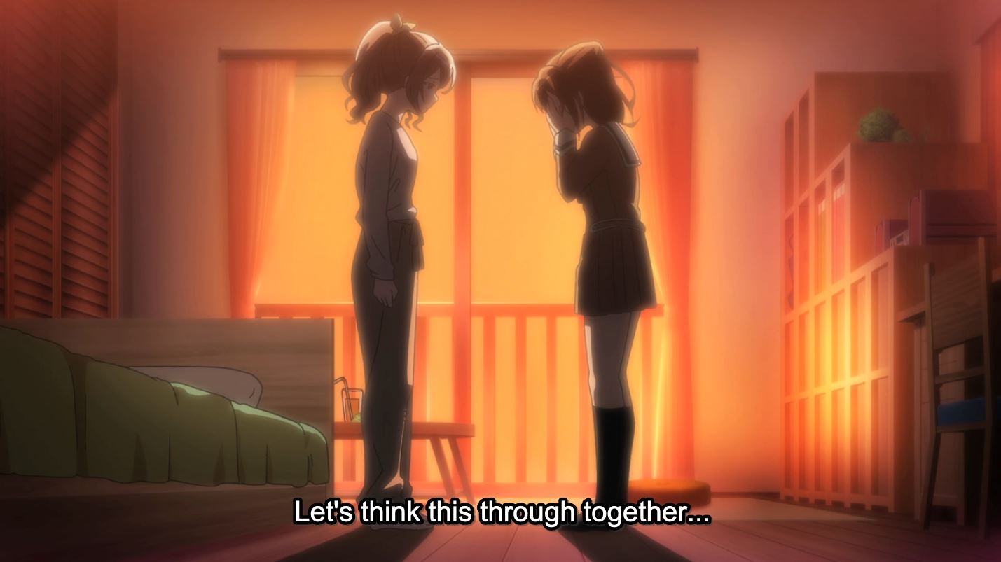 Two girls stand in a bedroom dimly lit by the setting sun. Saya stands with her hands limply to her side as Kasumi holder her hands up to her face. Subtitles: "Let's think this through together..."