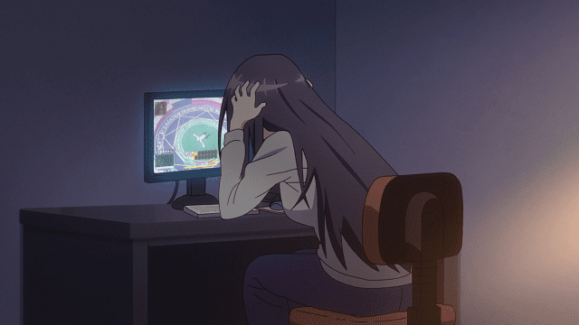A young woman sits in a dark room looking at a glowing computer screen and clutching her head in her hands.