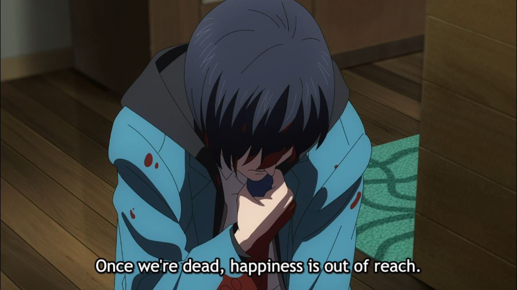 Mirai holding his chest. subtitle: Once we're dead, happiness is out of reach