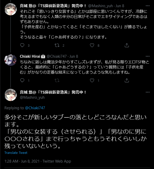 Discussing TS stories, Mashiro Yuh, a Japanese author of such stories, once opined to me that pregnancy might be the “only taboo left at the end” for such stories, as characters who were originally cishet men are rapidly desensitized to the concept of crossdressing or even engaging in sexual acts with other cishet men.