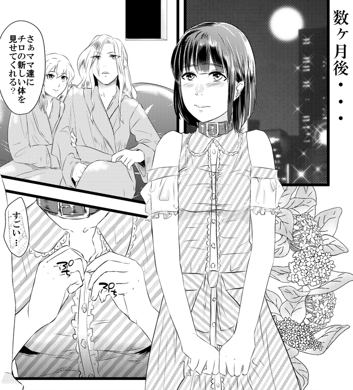A nervous looking woman with a bob cut wears a frilly dress and a thick collar around her neck. She looks nervous. A haughty looking woman in a bathrobe lounges with another woman wearing a bathroom in a second panel. The woman in the dress begins to undress.