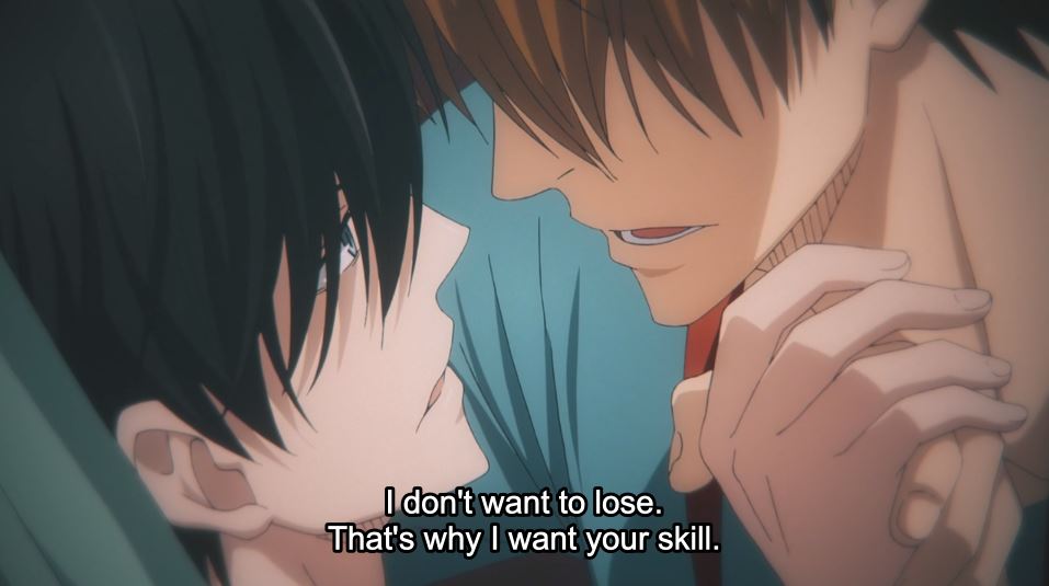 Junta and Takato acting in a scene, intimately close. subtitle: I don't want to lose. That's why I want your skill.