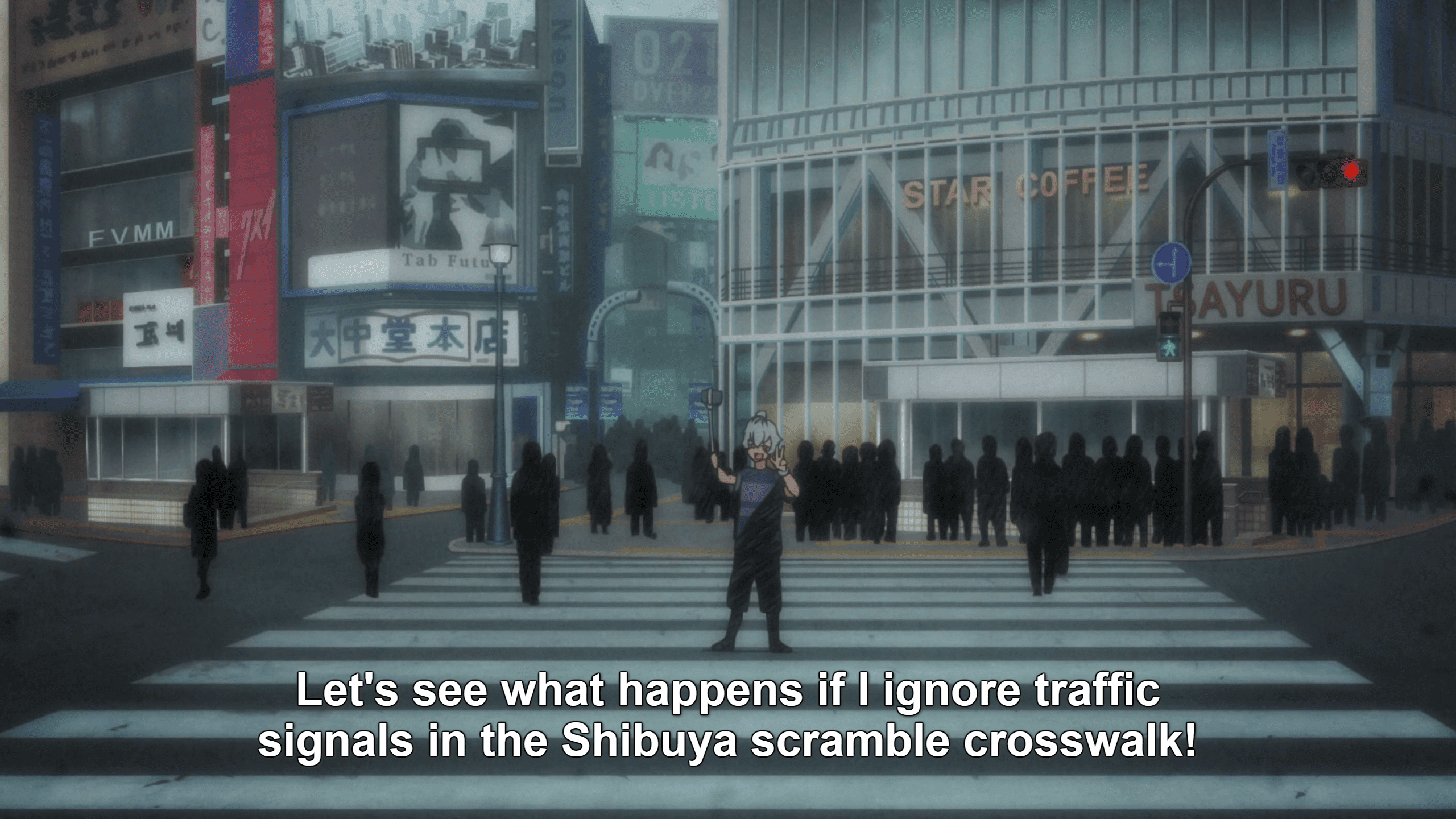 A teen boy stands in the middle of a busy crosswalk, holding a phone on a selfie stick and flashing a peace sign. He says "Let's see what happens if I ignore traffic signals in the Shibuya scramble crosswalk!"