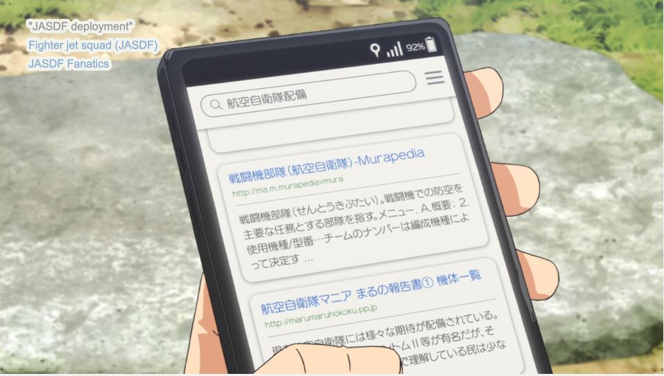 Kei excitedly rattles off details about joining the JSDF Air Academy, like its location, the free tuition, and how “you even get a salary!” He browses search results on his phone that include message boards for how swell the JSDF is. When he bikes to the military base, they pan over to the highway sign, so you can be really sure where to find it in real life. They made fighter jets into cute girls who’ll mack on you as soon as they meet you, for cripes’ sake.