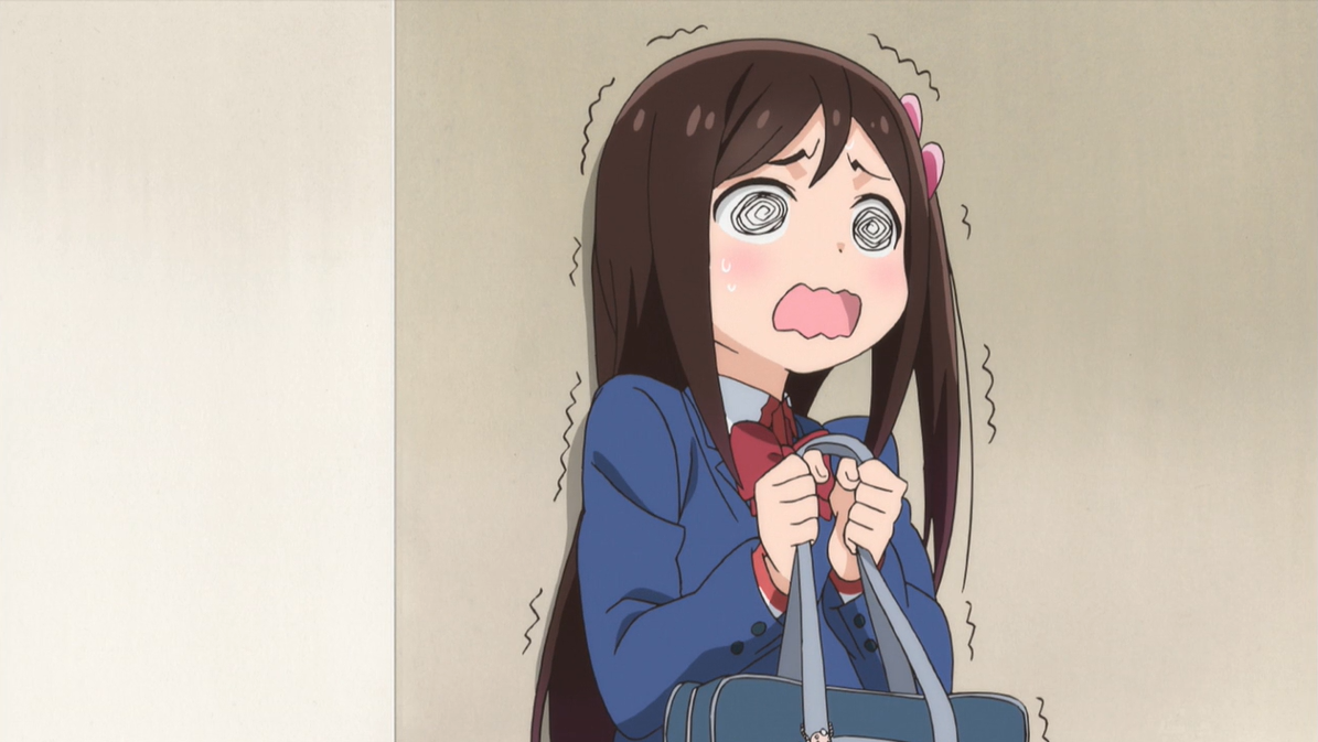 a long-haired girl clutching her bag, trembling and swirly-eyed with anxiety