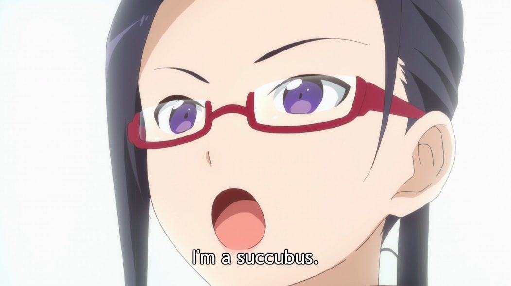 A closeup of a woman 's (Sato's) face. Subtitle: I'm a succubus.