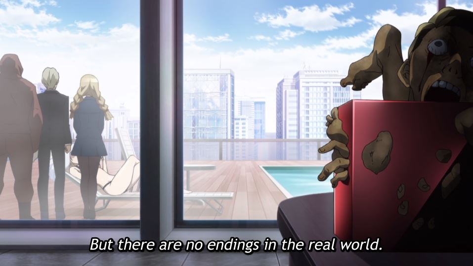 But for me, at least, the gory trimmings are offset by the sense that the series isn’t set on being relentlessly misanthropic. If I’m honest, the series’ attempts at seriousness often strode right on over into hilarity. When Asuka very seriously stated that “I’m not killing anyone now that I’m in high school,” I had to stop the stream and laugh for a full thirty seconds.