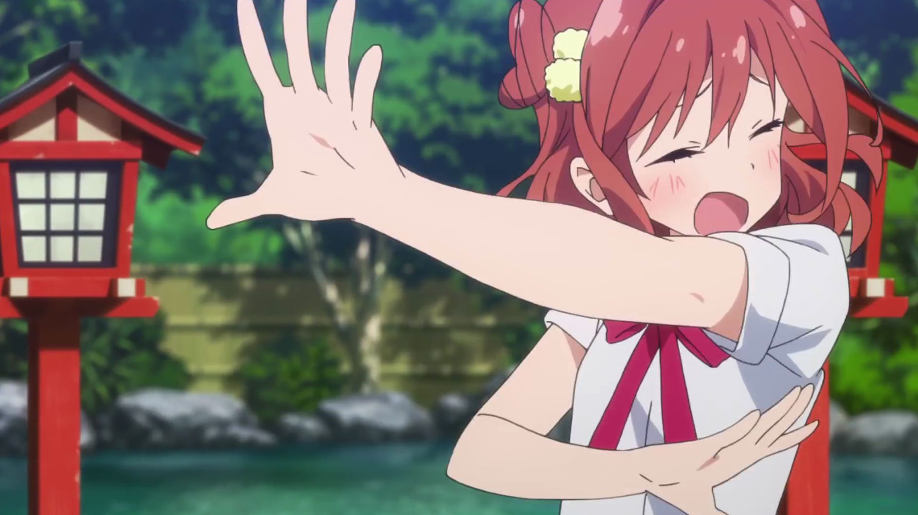 A teen girl blushes and holds out her hands as if to say "no"