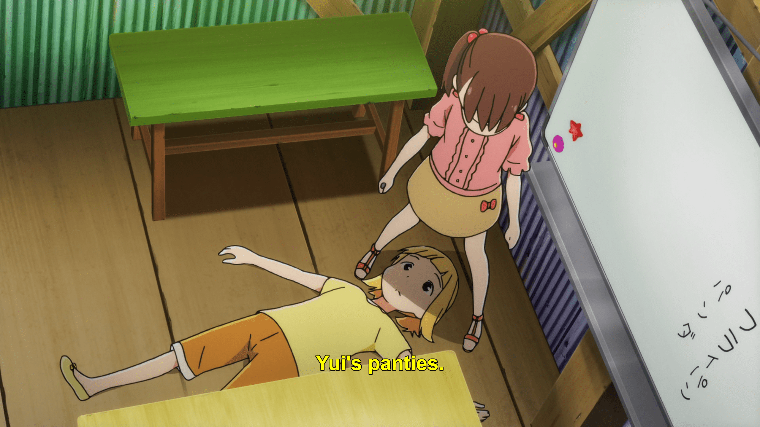 A shot from above in a room. A girl with a side ponytail stands near a whiteboard, looking down at another girl with short hair who's laying on the ground, looking up the other girl's skirt. Subtitles: "Yui's panties."