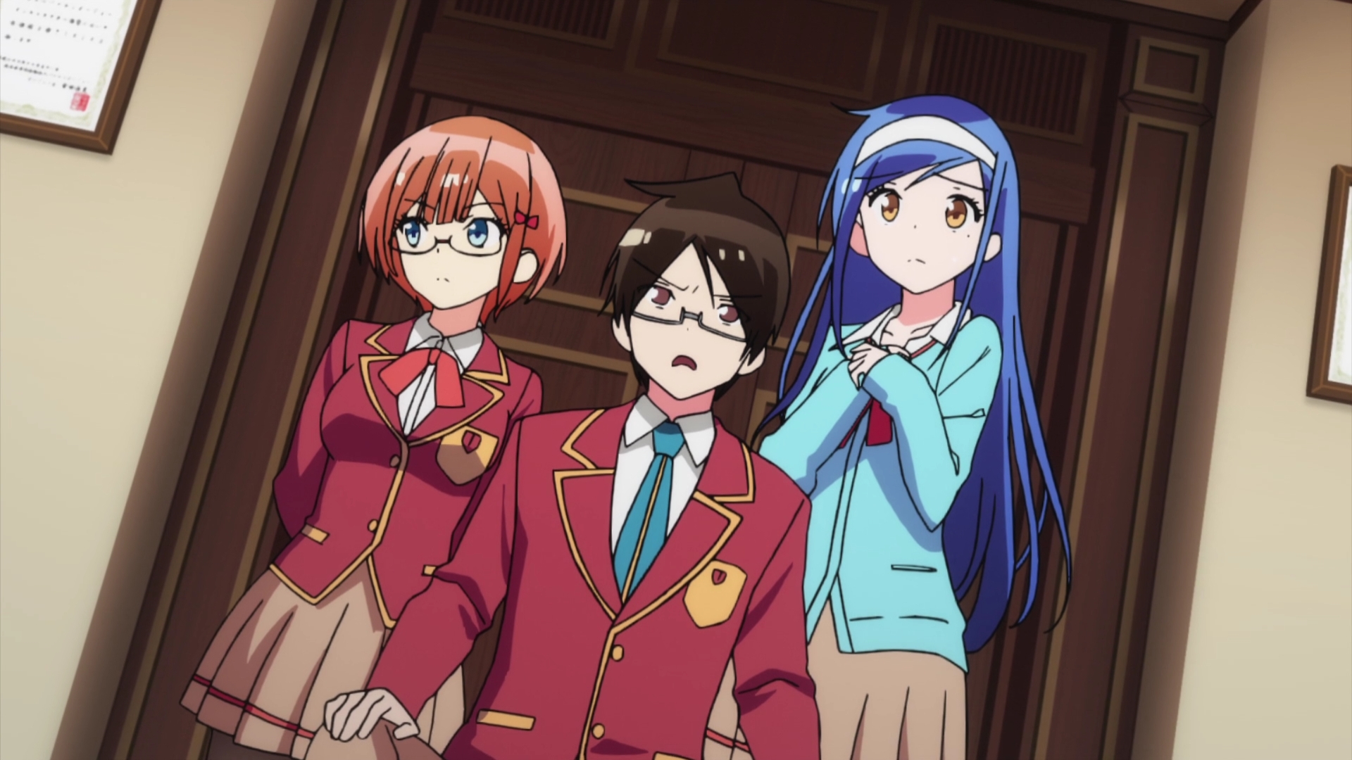 Two girls stand beside a boy who looks shocked. They wear school uniforms.