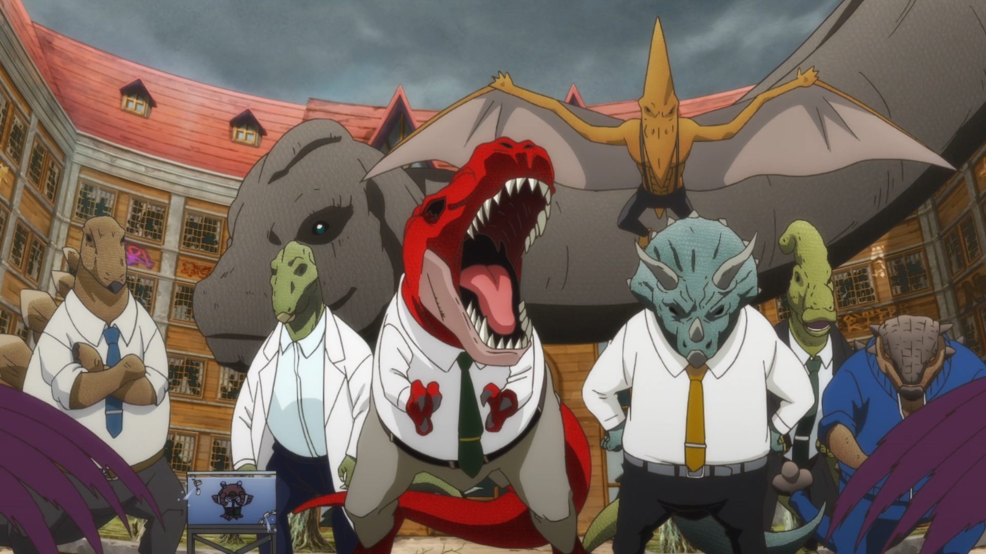 A group of giant and ferocious looking dinosaurs wearing shirts and ties stand before a half destroyed school.