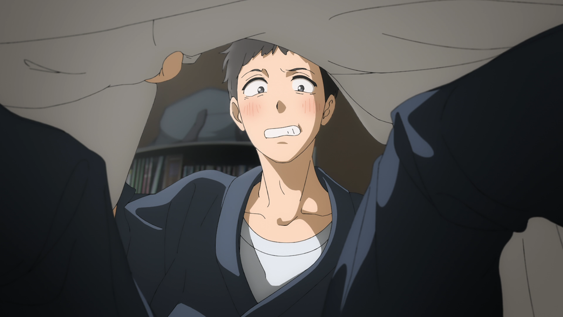 Gojo lifting up a curtain and looking embarassed and horrified at what he sees underneath