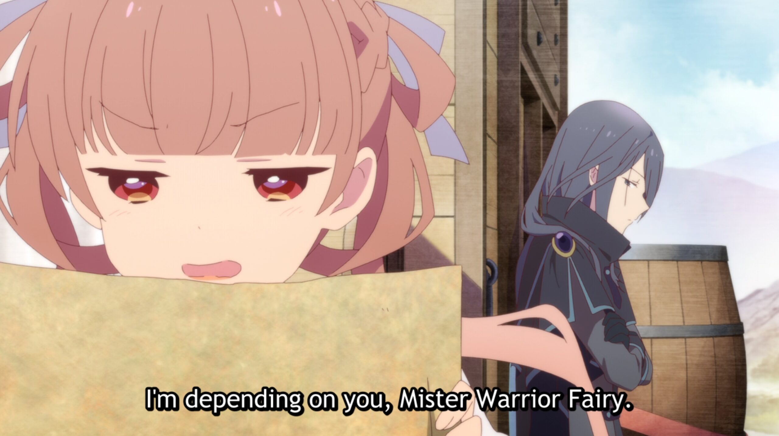 A young woman staring at a map with a cartoonish scowl. In the background, a man with long dark hair sits looking unimpressed with his arms folded. Subtitle text reads: I am depending on you, Mister Warrior Fairy.