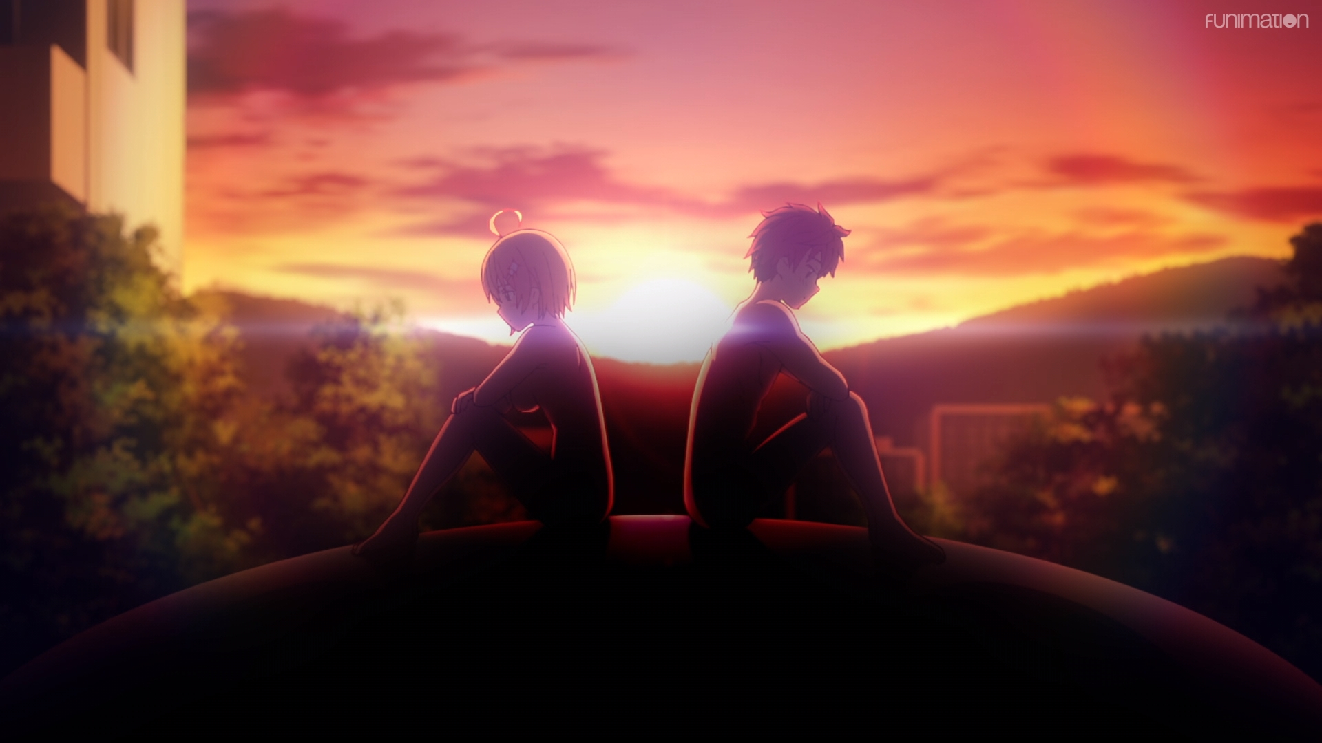 Kirara and Retto sitting naked atop a playground structure, silhouetted against the sunset