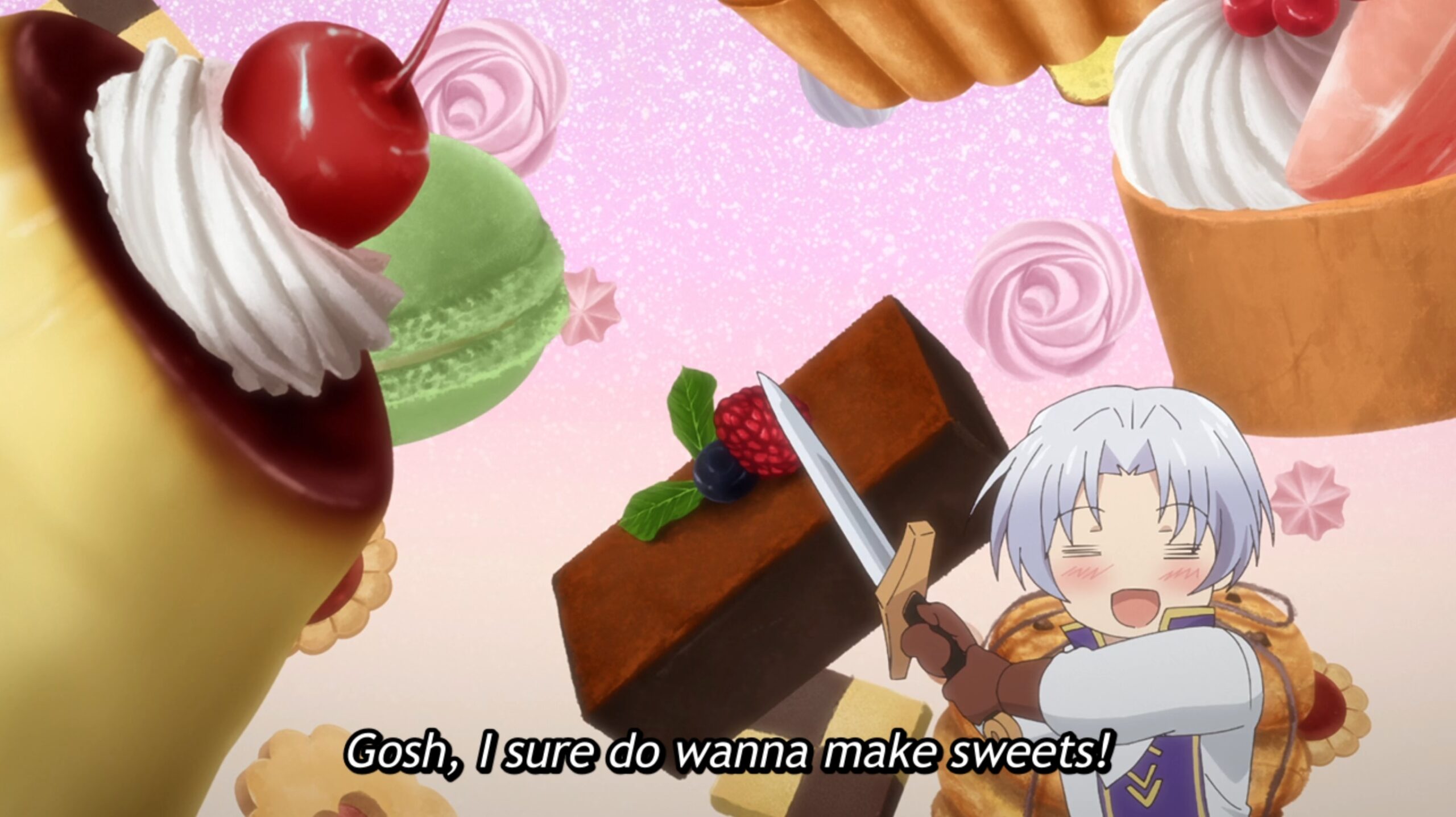 A young boy swinging a sword, but daydreaming of dessert, with cakes and macarons superimposed around him. Subtitle text reads: Gosh, I sure do wanna make sweets!