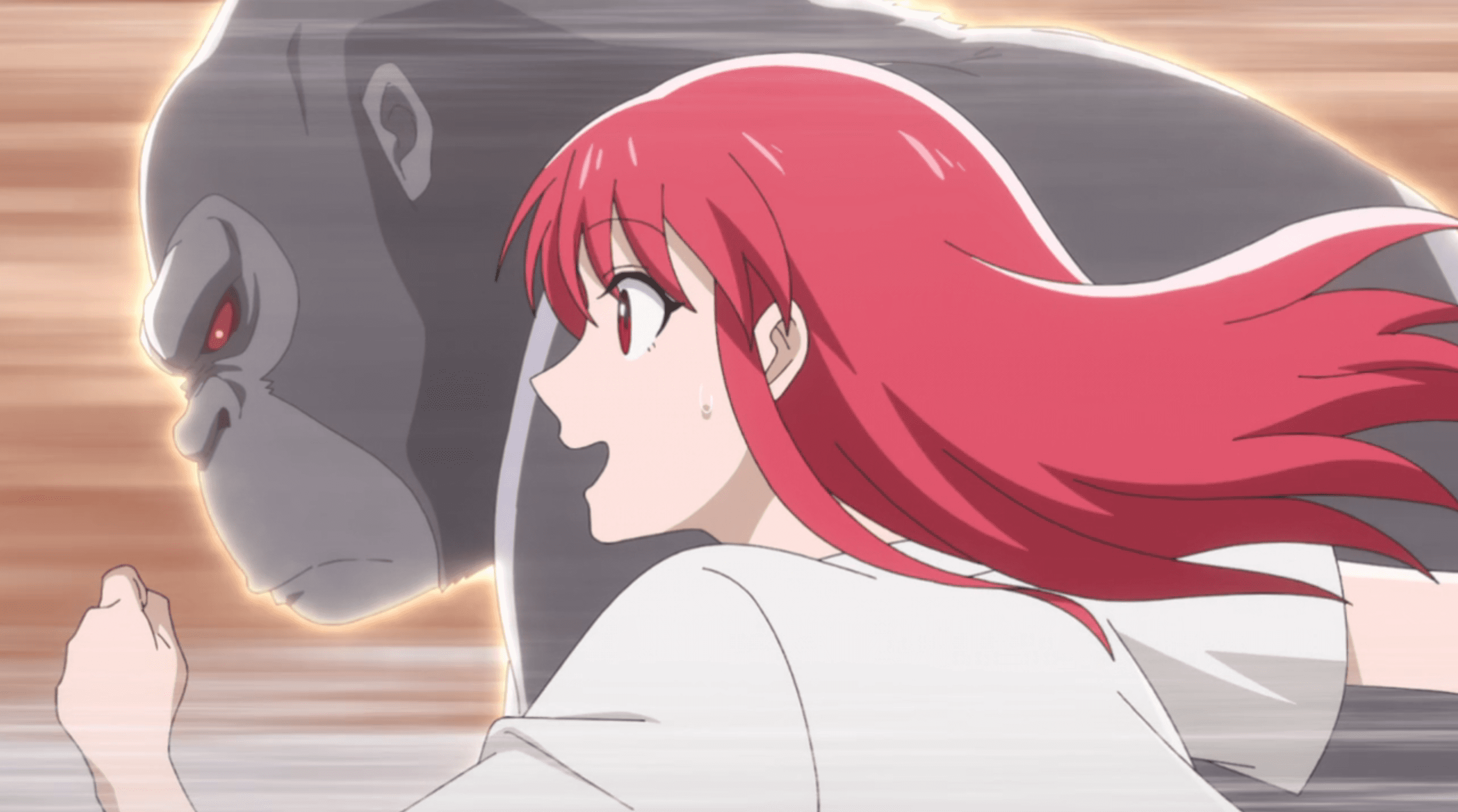 Profile shot of Sophia running. The gorilla god is superimposed beside her, glowing around the edges