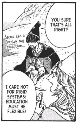 Olruggio looks skeptically at Beldaruit and says “You sure that’s all right? Seems like a pretty big exception.” Beldaruit confidently declares, “I care not for rigid systems! Education must be flexible!”