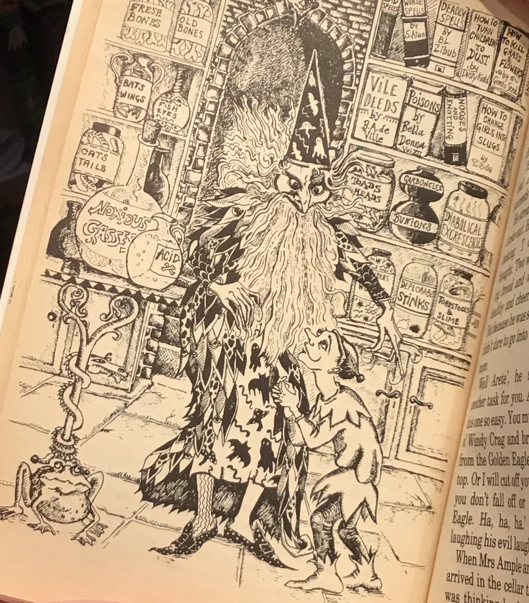 Illustration from The Clever Princess showing a crotchety wizard in a robe and pointy hat, surrounded by spellbooks with funny names