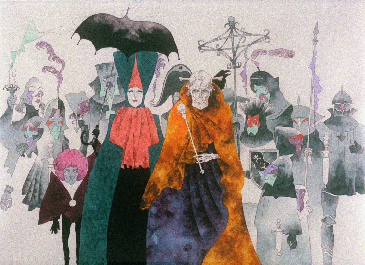 Stylized medieval figures in a watercolor-like art style