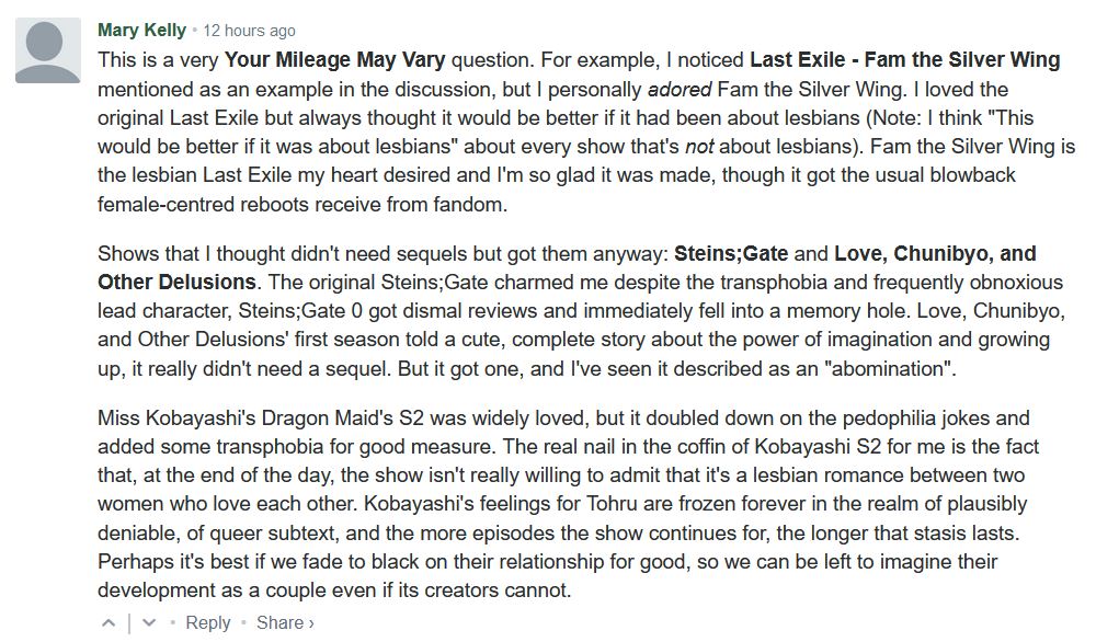 This is a very Your Mileage May Vary question. For example, I noticed Last Exile - Fam the Silver Wing mentioned as an example in the discussion, but I personally adored Fam the Silver Wing. I loved the original Last Exile but always thought it would be better if it had been about lesbians (Note: I think "This would be better if it was about lesbians" about every show that's not about lesbians). Fam the Silver Wing is the lesbian Last Exile my heart desired and I'm so glad it was made, though it got the usual blowback female-centred reboots receive from fandom. Shows that I thought didn't need sequels but got them anyway: Steins;Gate and Love, Chunibyo, and Other Delusions. The original Steins;Gate charmed me despite the transphobia and frequently obnoxious lead character, Steins;Gate 0 got dismal reviews and immediately fell into a memory hole. Love, Chunibyo, and Other Delusions' first season told a cute, complete story about the power of imagination and growing up, it really didn't need a sequel. But it got one, and I've seen it described as an "abomination". Miss Kobayashi's Dragon Maid's S2 was widely loved, but it doubled down on the pedophilia jokes and added some transphobia for good measure. The real nail in the coffin of Kobayashi S2 for me is the fact that, at the end of the day, the show isn't really willing to admit that it's a lesbian romance between two women who love each other. Kobayashi's feelings for Tohru are frozen forever in the realm of plausibly deniable, of queer subtext, and the more episodes the show continues for, the longer that stasis lasts. Perhaps it's best if we fade to black on their relationship for good, so we can be left to imagine their development as a couple even if its creators cannot.