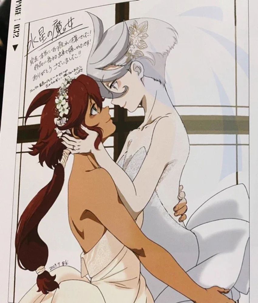 Suletta lifting Miorine in her arms, both wearing wedding dresses