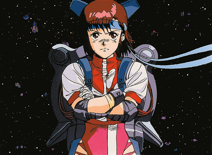 Noriko from Gunbuster frowning determinedly with her arms crossed from her pilot's chair