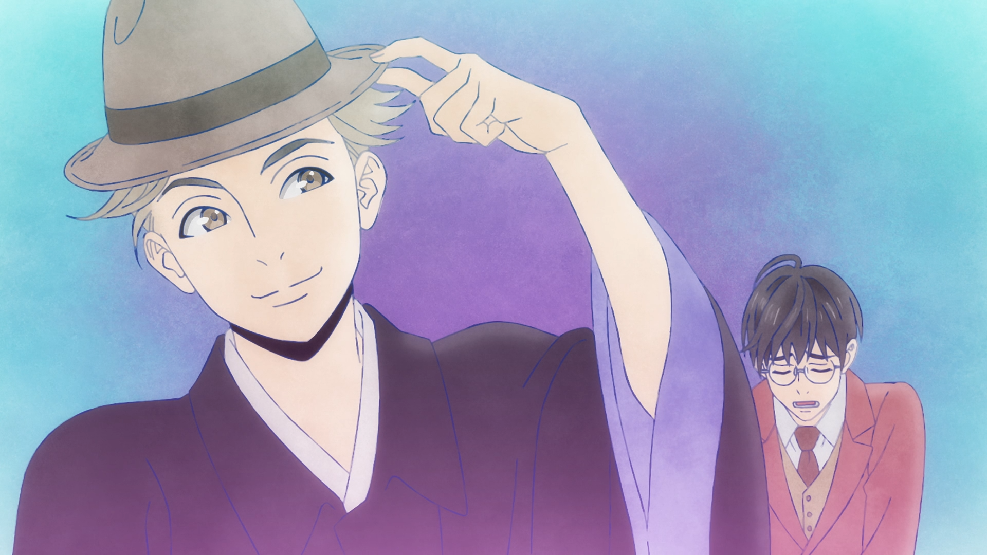 A man (Ishikawa) in a kimono wears a western hat looking content, a second man (Kindaichi) behind him looks distraught and depressed