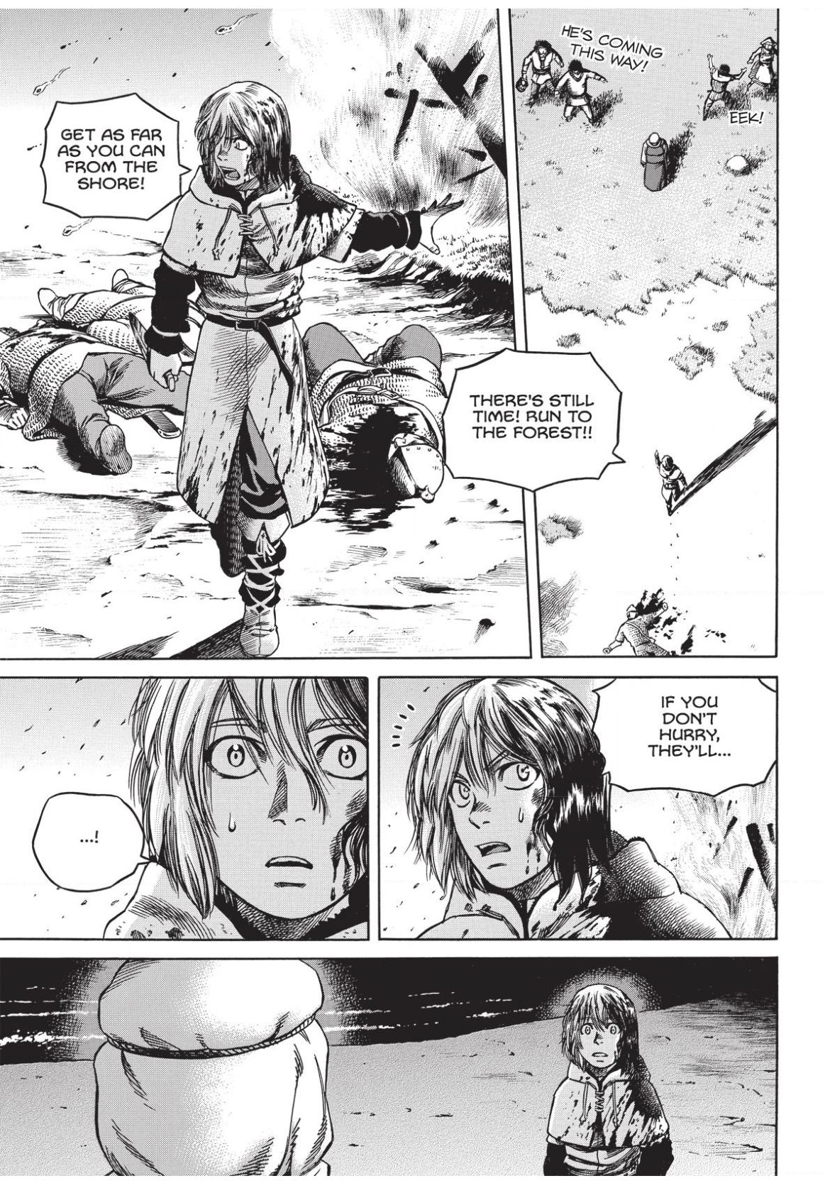 Teenage Thorfinn warns survivors of a viking attack to run away